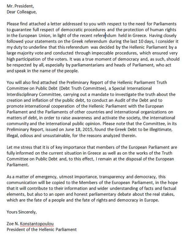 Via Elke Schenk poste ich den Brief der Griechischen Parlamentpräsidentin Zoe Konstaninopoulou vom , den sie an Martin Schulz in seiner Eigenschaft als Präsident des EU Parlaments schrieb.
