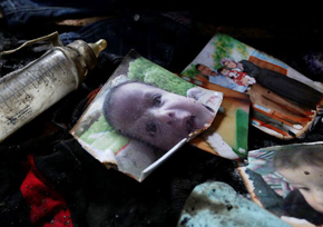 | Zerstörtes Photo von einem verbrannten Baby — Opfer von Siedlergewalt |