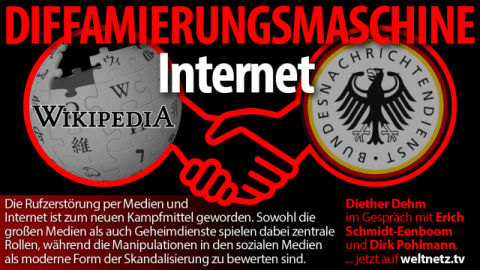 Die Rufzerstörung per Medien und Internet ist zum neuen Kampfmittel geworden. Sowohl die großen Medien als auch Geheimdienste spielen dabei zentrale Rollen, während die Manipulationen in den sozialen Medien als moderne Skandalisierungsformen zu bewerten sind. Einer der bedeutendsten Rechercheure und Kenner der Geheimdienstszene und deren Einflussnahmen auf die Medien ist Erich Schmidt Eenboom. Er hat darüber verschiedene Bücher geschrieben, zuletzt Spionage unter Freunden. Der Autor und Dokumentarfilmer Dirk Pohlmann hat mehr als 20 international vom ZDF verkaufte Dokumentationen produziert. Pohlmann schildert, wie die Wikipedia, besonders die deutsche Ausgabe, heute an vorderster Stelle dazu beiträgt, Menschen zu denunzieren und zu diffamieren. Das Gespräch führte der Linken-Bundestagsabgeordnete Diether Dehm.
