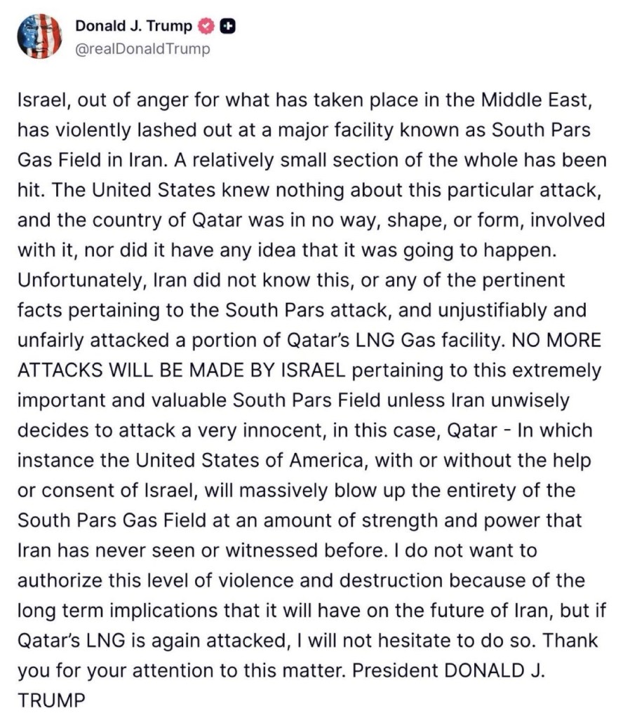 und hatte auch keine Ahnung, dass er stattfinden würde. Leider wusste der Iran dies nicht, ebenso wenig wie die relevanten Fakten bezüglich des Angriffs auf South Pars, und griff ungerechtfertigt und unfair einen Teil der LNG-Gasanlage Katars an. Es werden KEINE WEITEREN ANGRIFFE VON ISRAEL auf dieses äußerst wichtige und wertvolle South-Pars-Feld erfolgen, es sei denn, der Iran beschließt unklugerweise, ein völlig unschuldiges Land, in diesem Fall Katar, anzugreifen – in welchem Fall die Vereinigten Staaten von Amerika, mit oder ohne die Hilfe oder Zustimmung Israels, das gesamte South-Pars-Gasfeld mit einer Stärke und Kraft in die Luft jagen werden, wie sie der Iran noch nie zuvor gesehen oder erlebt hat. Ich möchte ein solches Ausmaß an Gewalt und Zerstörung aufgrund der langfristigen Auswirkungen, die dies auf die Zukunft des Iran haben wird, nicht genehmigen, doch sollte Katars LNG-Anlage erneut angegriffen werden, werde ich nicht zögern, dies zu tun. Vielen